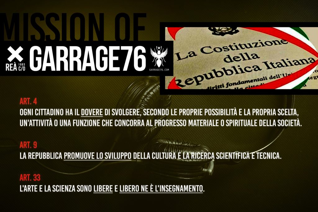 Uno dei fondanti obiettivi del programma Reà c/o GARRAGE76 è quello di costruire Formazione e Informazione nel settore della Creatività Contemporanea, attraverso percorsi culturali di Ricerca e Sperimentazione tra arte, musica, moda, cinema, letteratura e pratiche affini.